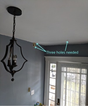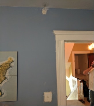 The above picture shows the route we took from the switch box to the light: one hole on the wall (behind the wallpaper), one hole on the ceiling right above it, and one more hole in line with the light. This route allows us to fish the wiring from the switch box to the light.