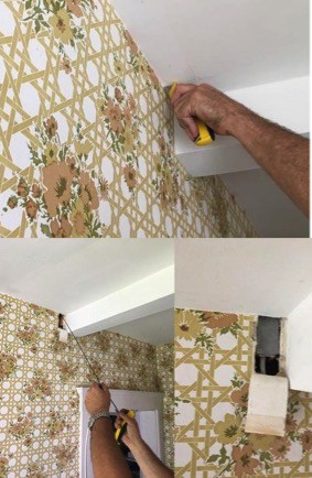 Wallpaper can pose some issues. As I mentioned earlier, some holes need to be made to fish the new wiring. Depending on the condition of the wallpaper, it can often be sliced, peeled away from the wall, and glued back. If the wallpaper won’t peel, it typically rips. To see an example, take a look at the photos below. But try not to judge the wallpaper design!